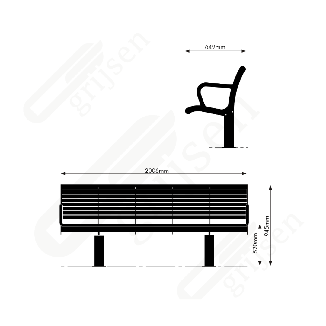 Banc : L = 2006 mm, l = 649 mm, H de l’assise = 520 mm,
